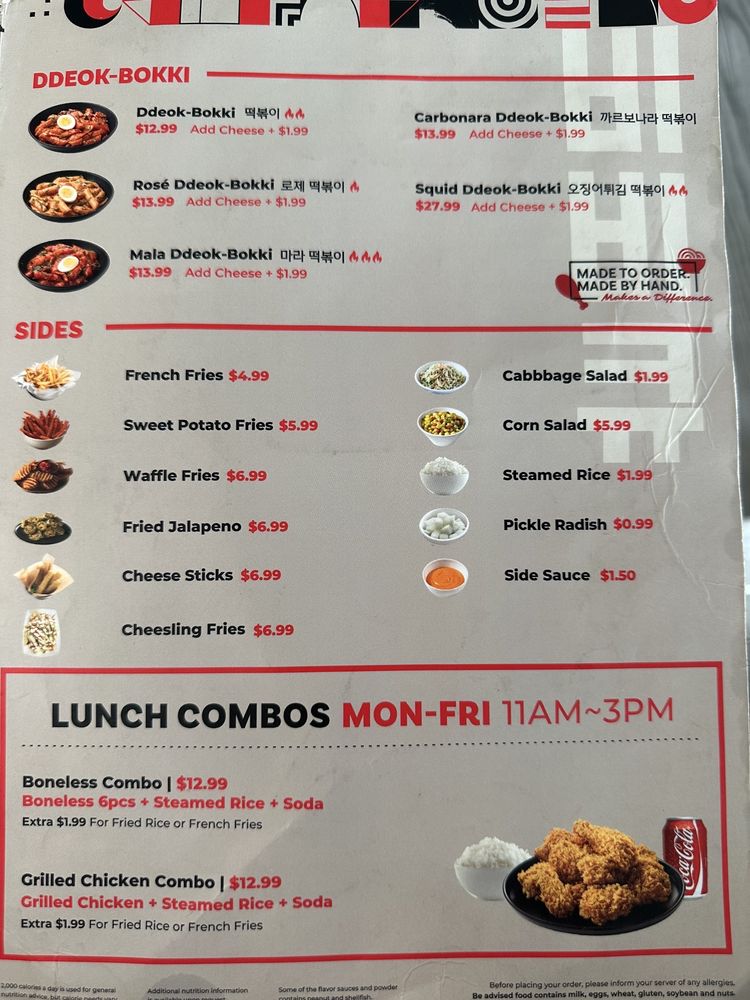 The same rice and fish cakes we use in traditional Ddeok-Bokki, but cooked in our very spicy mala sauce. The cabbage, egg, and sesame seeds provide a nice balance, yet the heat is still the hero of this dish.